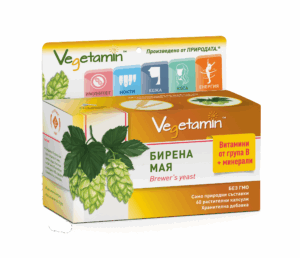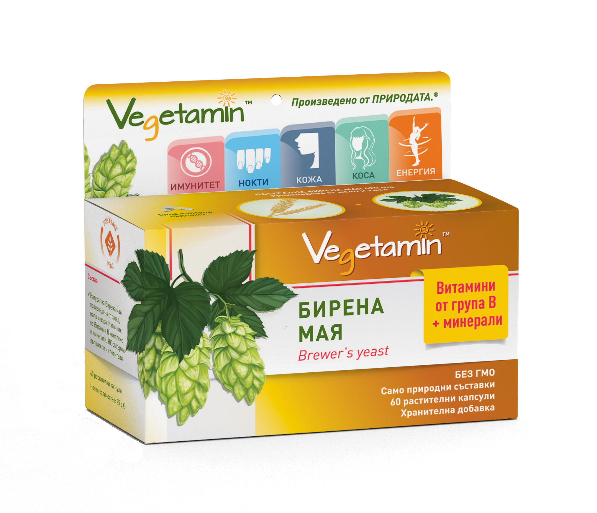 • Бирена маяв капсули, синтезирана от естествената ферментация на хмел и малц. Бирената мая е източник на витамин В комплекс.