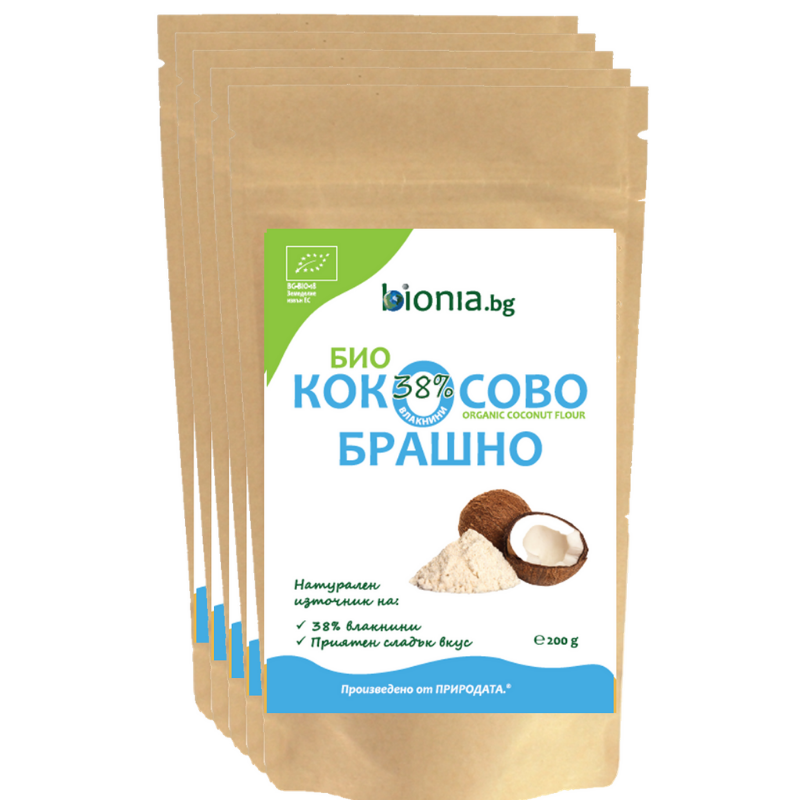 Съставки: 100% кокосово брашно*. ℮ 1 kg (5×200 g)