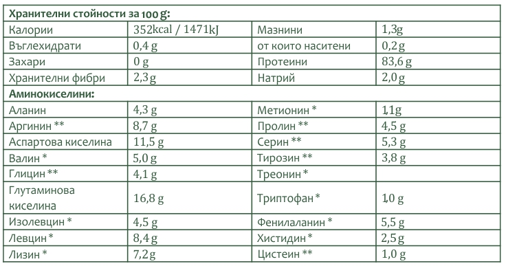 Изключително богат протеинов състав. Балансиран аминокиселинен профил. Не се складира в тялото под формата на мазнина. Утолява усещането за глад. Богат източник на аминокиселини за контрол на телесното тегло, храна за спортисти и при специфични диетологични нужди.